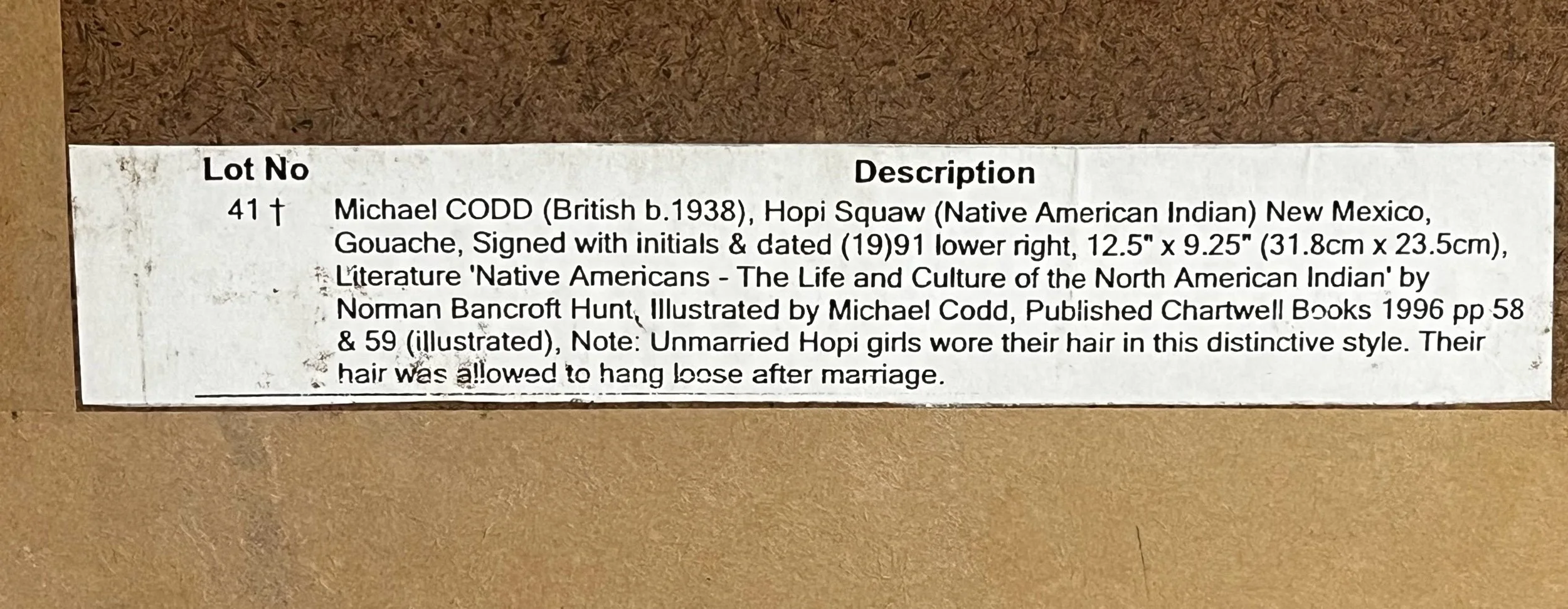 The product is an signed original painting by artist Michael Codd, titled 'HOPI SQUAW'. Measuring 50cm in height and 40cm in width, this unique piece depicts a native American theme inspired by the Hopi culture. Created on paper in the 1970s, it is a one-of-a-kind (OOAK) artwork that comes mounted and framed, adding to its collectible value. This rare and beautifully crafted piece would make a striking addition to any art collection, showcasing the rich history and beauty of the Hopi tribe.