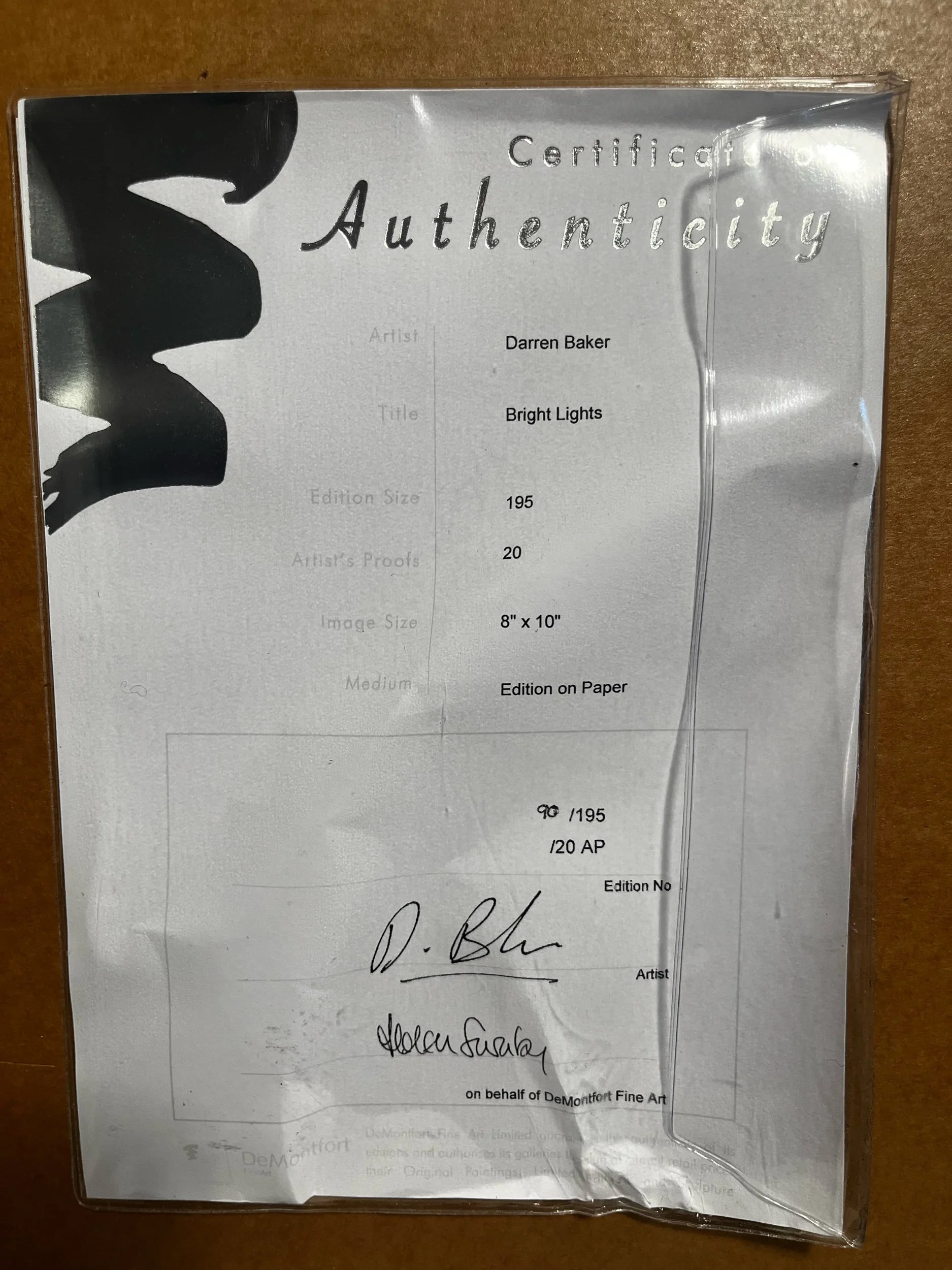 The ‘Bright Lights - Monte Carlo’ print by Darren Baker is a limited edition print mounted and framed. Measuring 48cm in height and 52cm in width, this signed print is from the United Kingdom and comes with a certificate of authenticity. The artwork captures a vibrant and energetic aesthetic, making it a unique and collectible addition to any art enthusiast's collection.