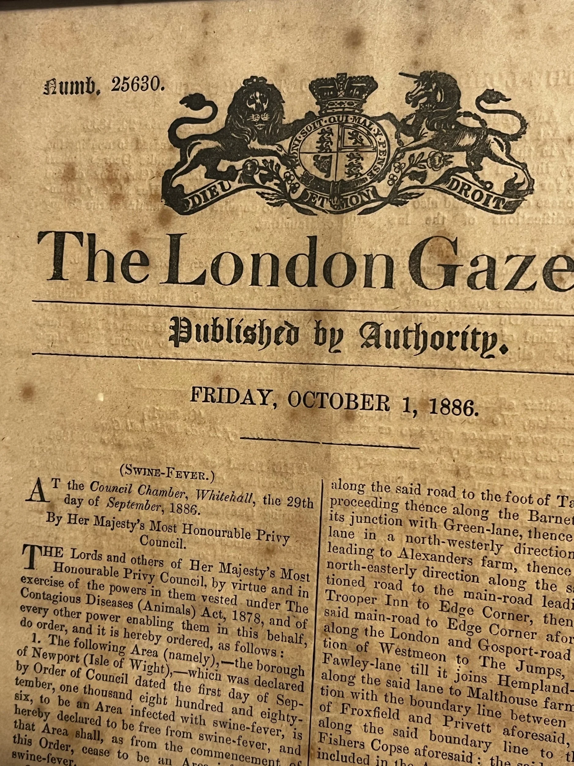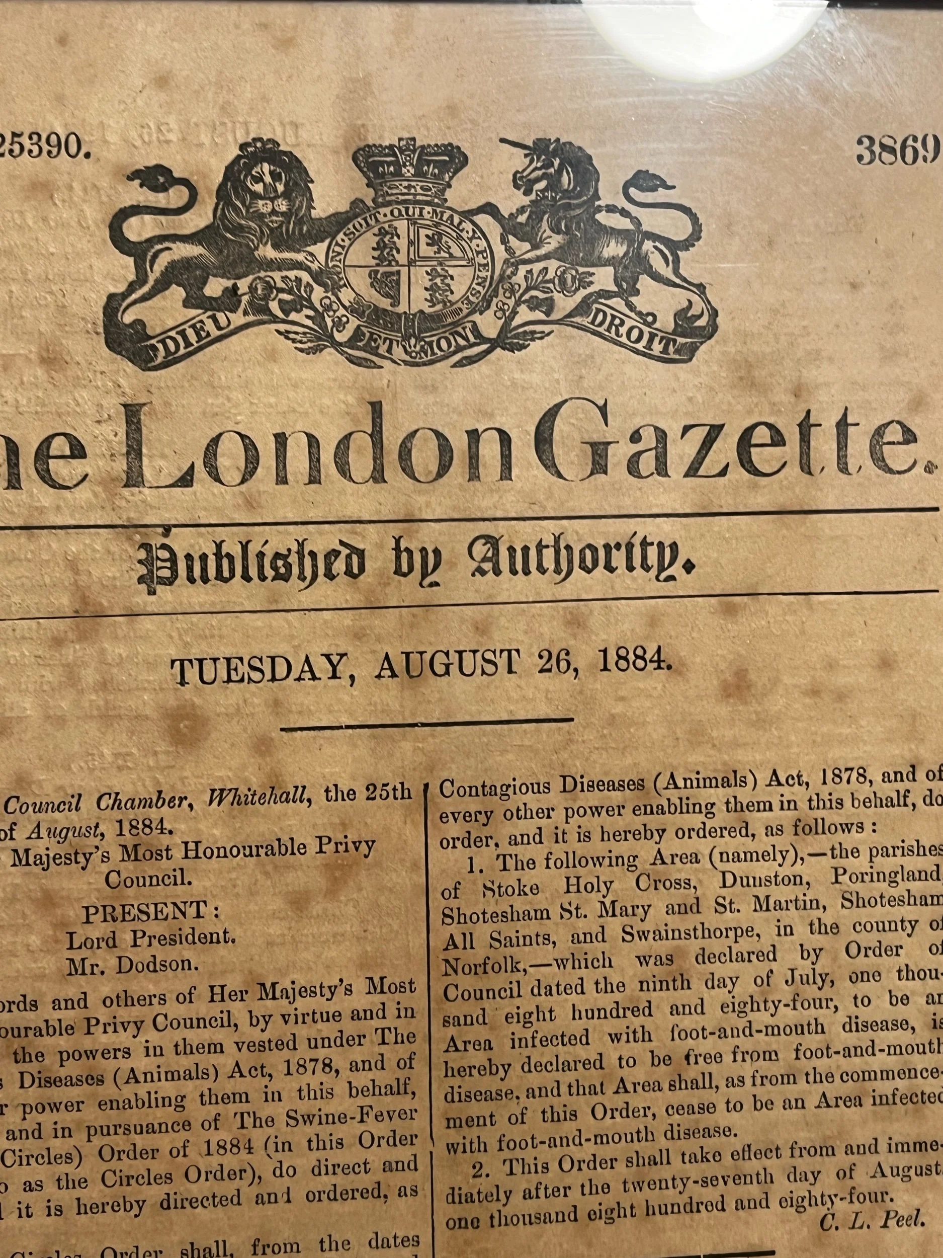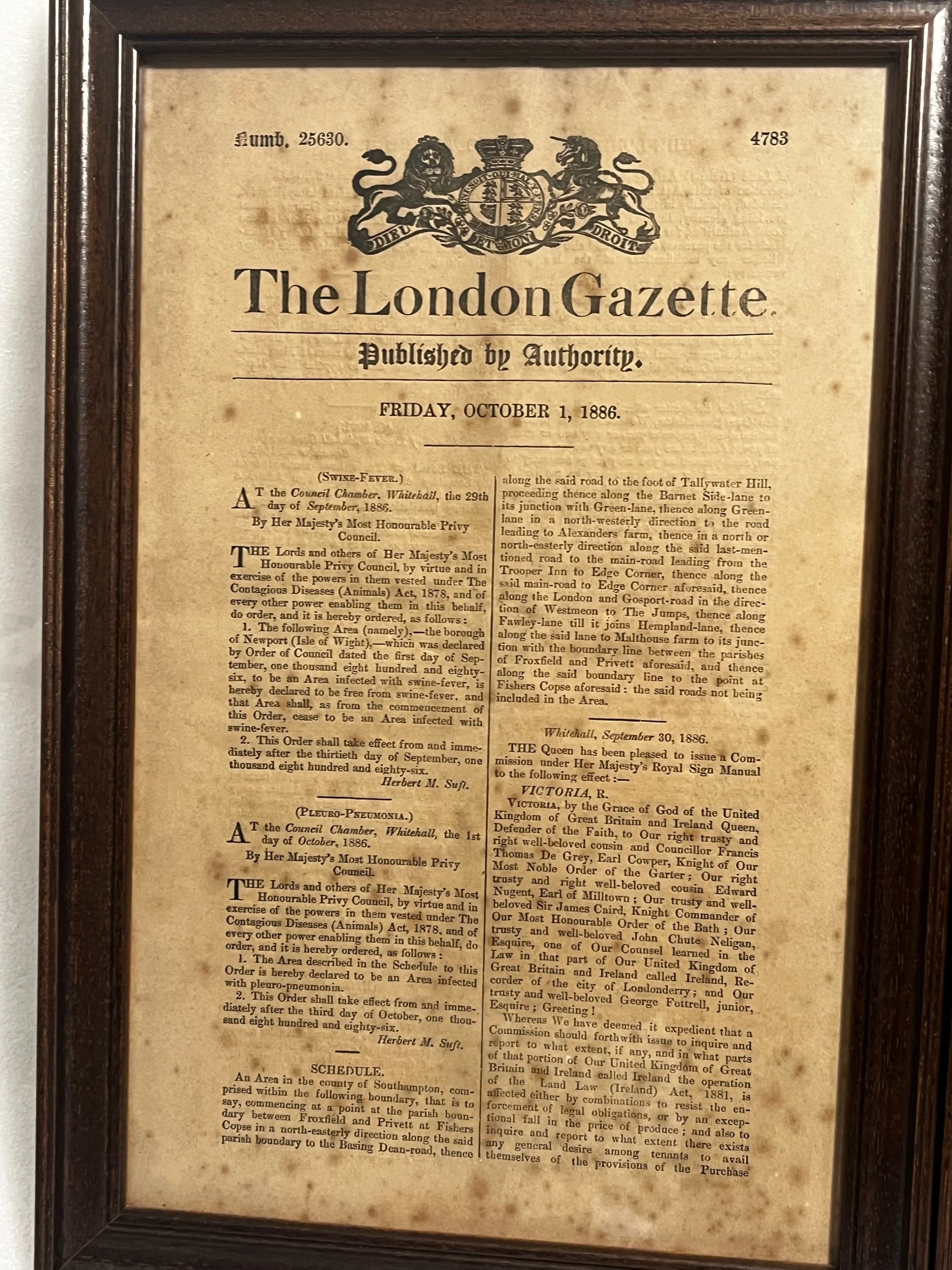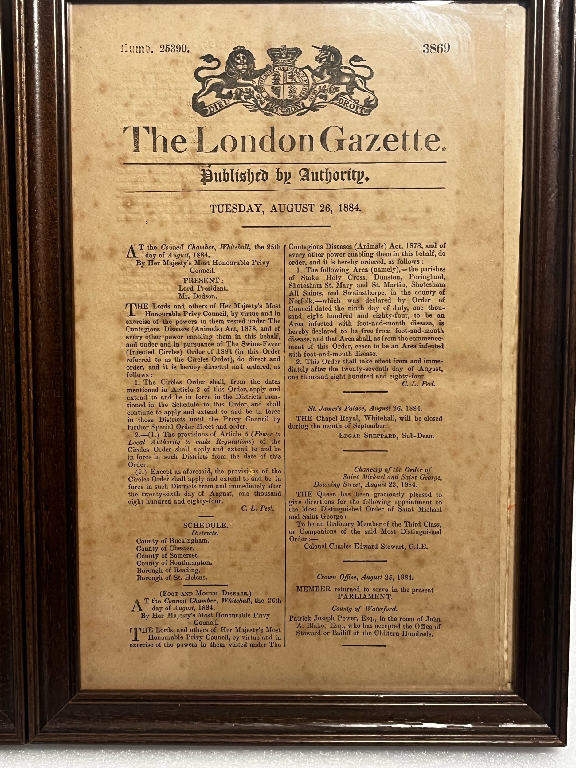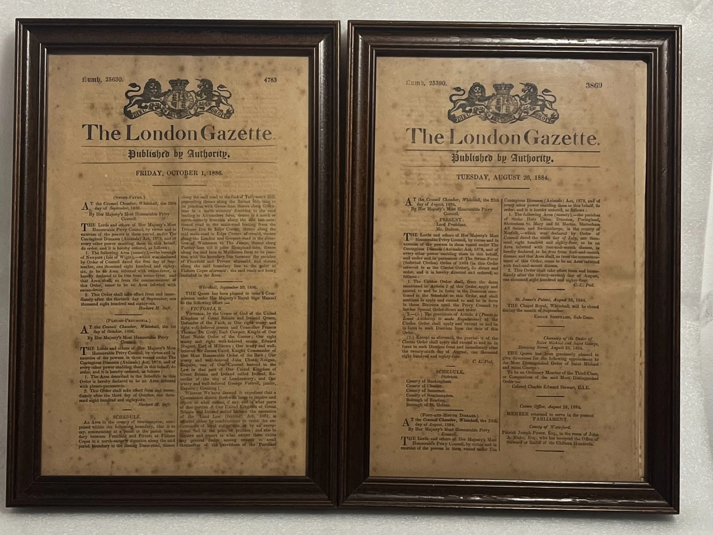 Two Framed Original Copies Of The London Gazette Dated 1884 And 1886